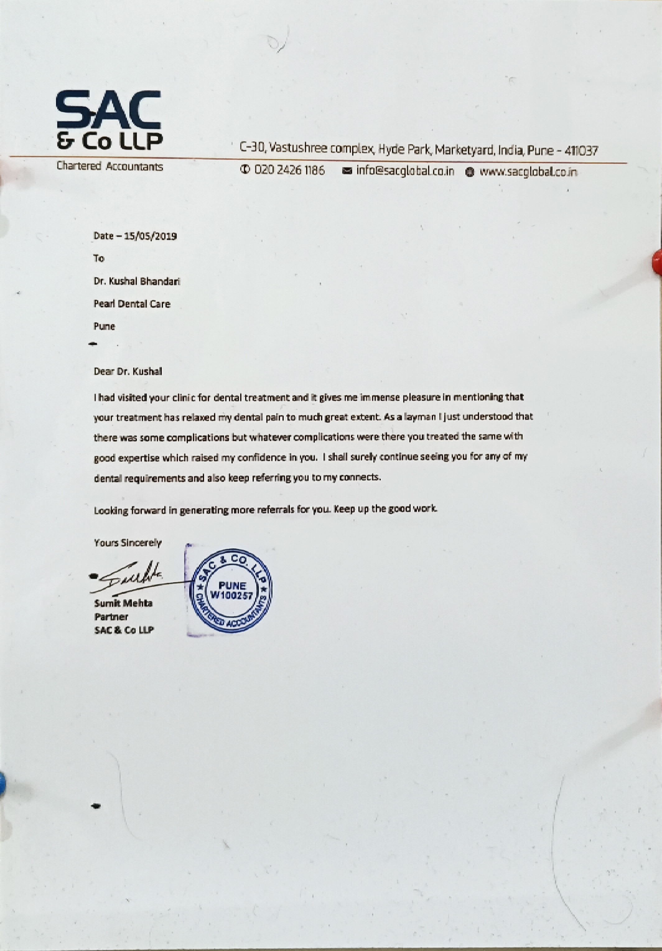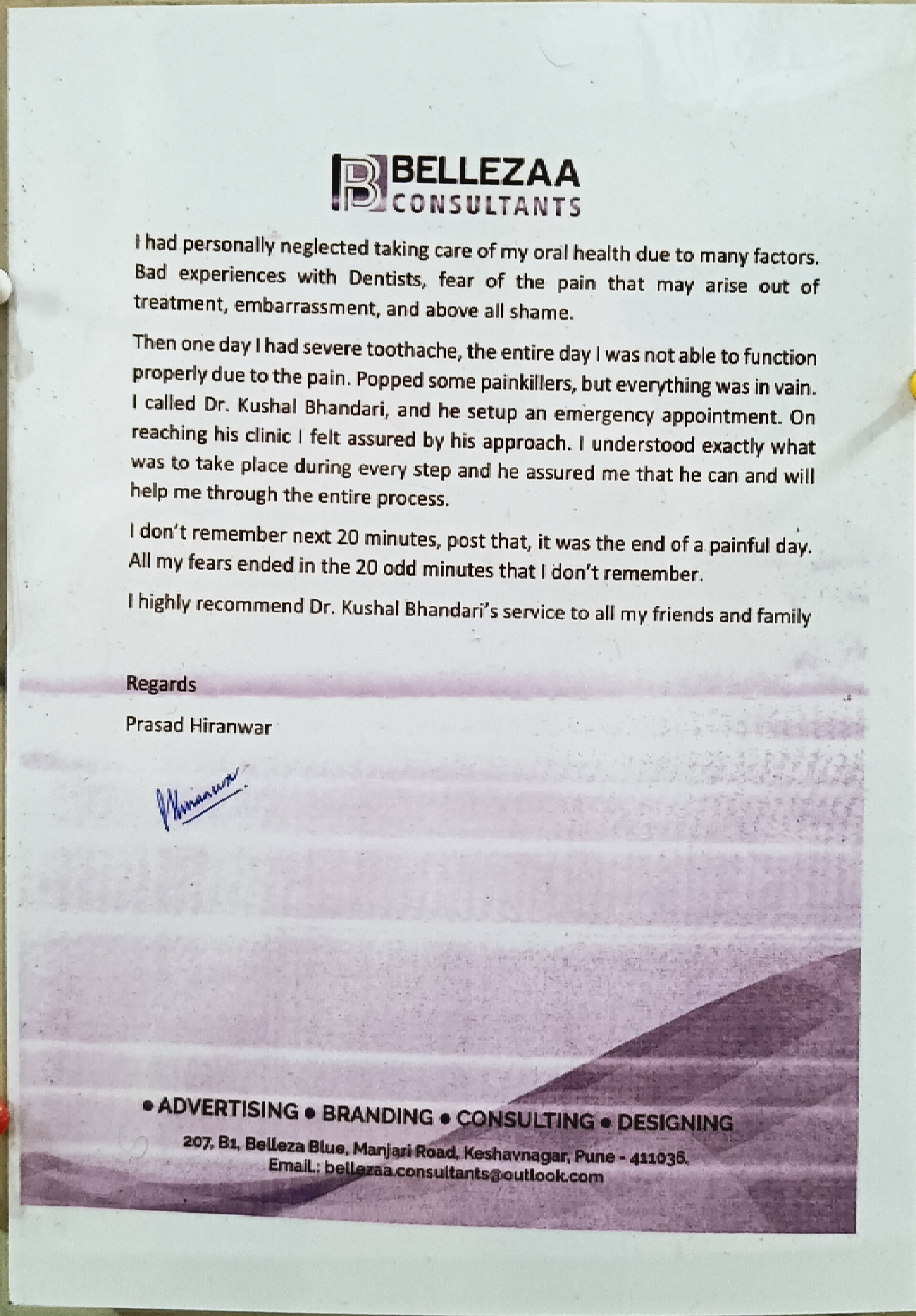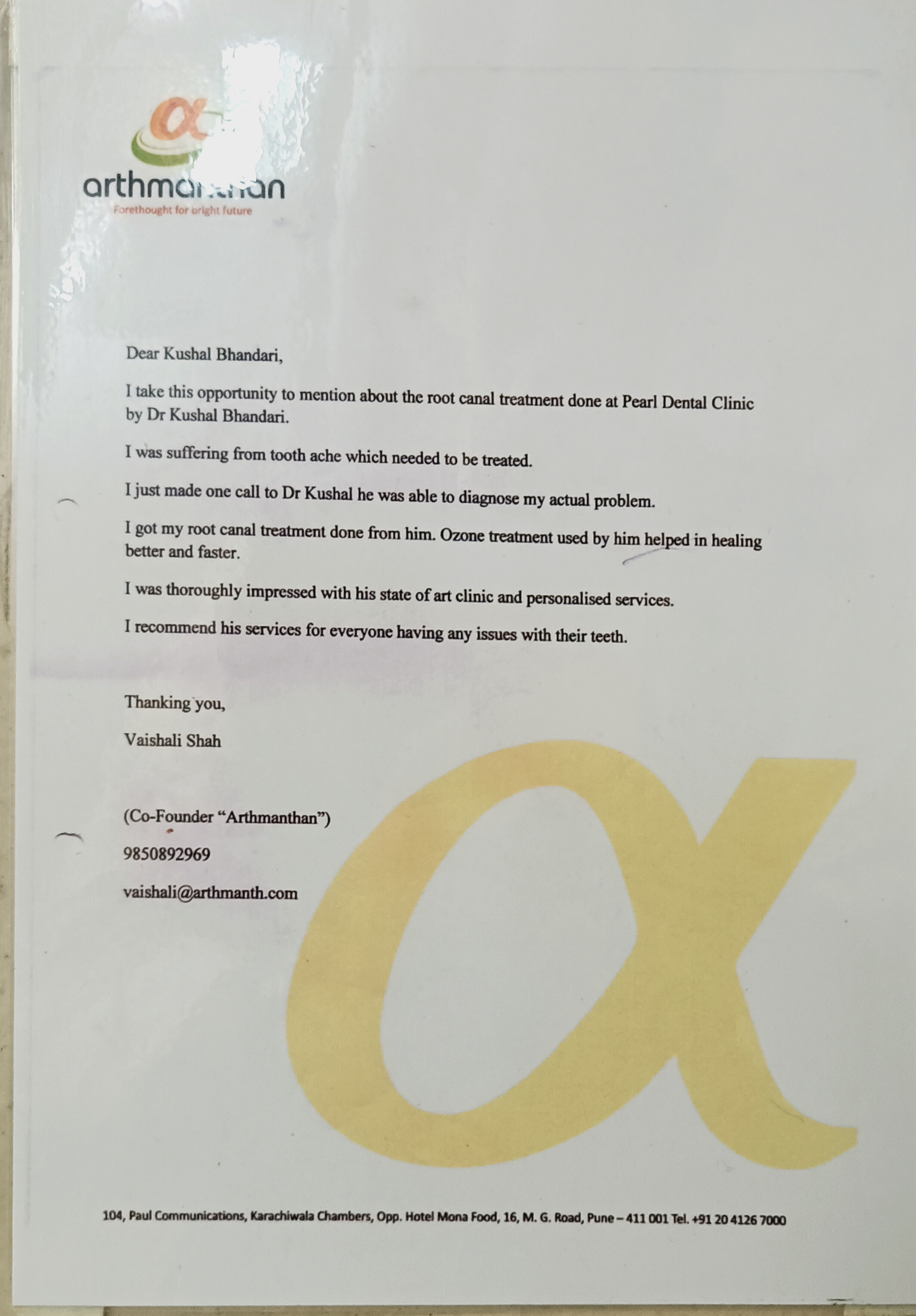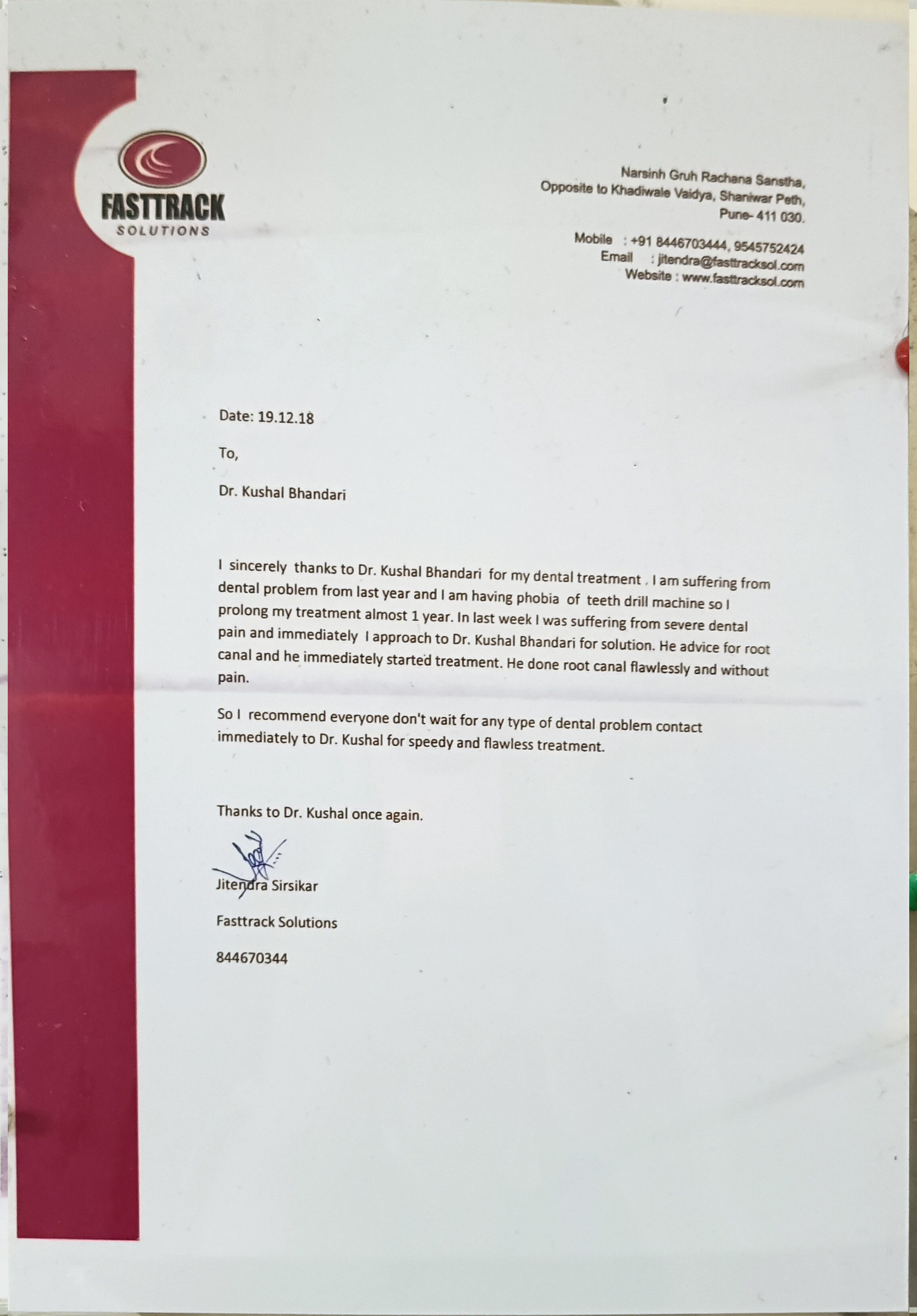 Dr Kushal has been brilliant in treating my dental problems. I visited him for a toothache and found that the issue was far more complicated than just a toothache and would need multiple sittings. Add to this that I was travelling and had only a few days to get this treatment done. Dr Kushal was fantastic at scheduling my treatment around my travel arrangements and was able to complete the treatment before I travelled abroad. Not only was he good at scheduling, the treatment itself was a breeze. He gave me the confidence that the necessary steps can be performed before I travelled abroad and he completed them as he had mentioned. Really thankful towards him for relieving me of the pain and taking steps to avoid the pain from coming back. On another occasion, while living abroad, he helped me understand the possible cause of my toothache and medicines I could find locally to get rid of the pain. Not only is Kushal brilliant in his skills, he has a fantastic attitude, has a friendly nature towards his patients and is eager to relieve them from their pains. Thank you very much Kushal!